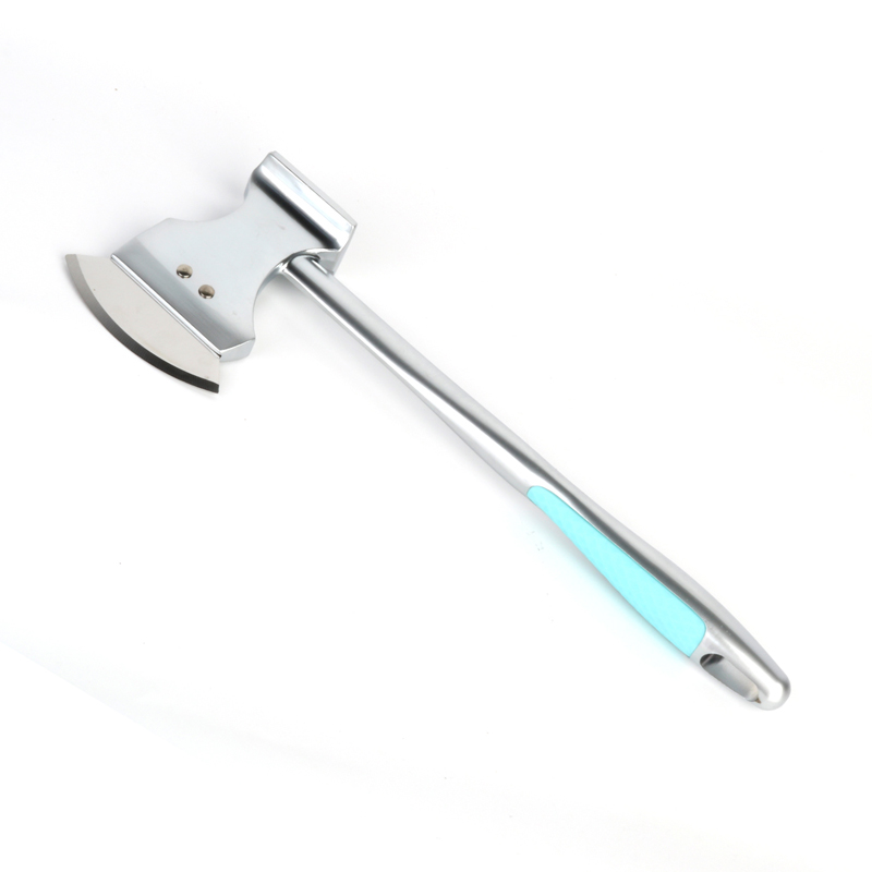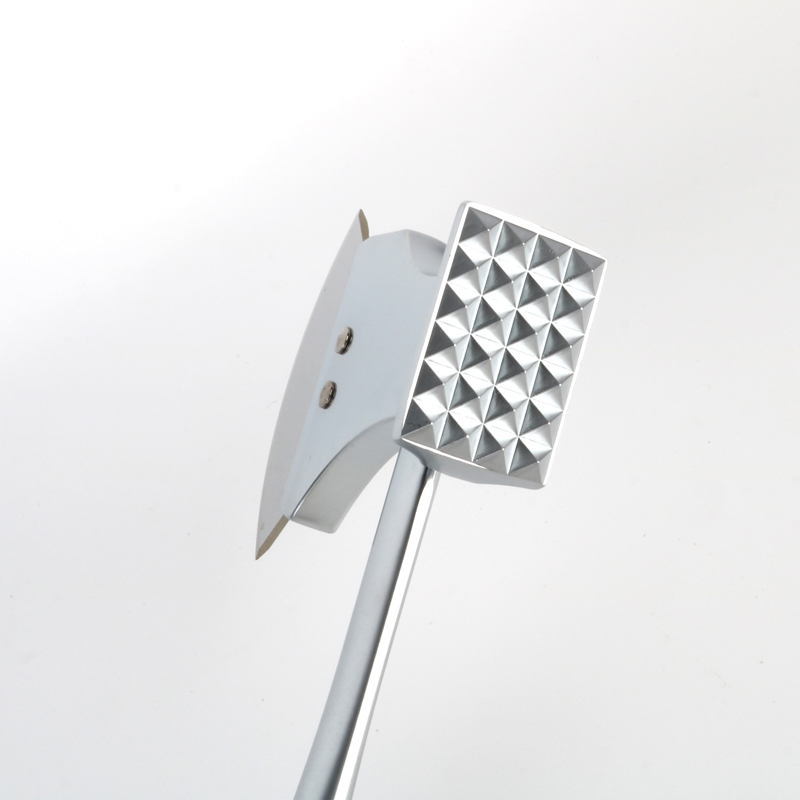 புதிய வடிவமைப்பு ஜிங்க் அலாய் மீட் டெண்டரைசர் மற்றும் பீஸ்ஸா கட்டர் என இரண்டிலும் செயல்படும் ஆல் இன் ஒன் கருவி, 25 செ.மீ நீளம் கொண்டது. முன்பகுதி இரண்டு செயல்பாட்டு மேற்பரப்புகளாக பிரிக்கப்பட்டுள்ளது: ஒன்று இறைச்சி டெண்டரைசருக்கும் மற்றொன்று பீட்சா கட்டருக்கும். கைப்பிடியானது தடிமனான வடிவத்துடன் வடிவமைக்கப்பட்டுள்ளது. ஏபிஎஸ் பிளாஸ்டிக்கால் செய்யப்பட்ட மெத்தை கைப்பிடியின் வால் பகுதியில் சேர்க்கப்பட்டுள்ளது, இது உள்ளங்கை வலியைக் குறைக்கிறது மற்றும் நீடித்த பயன்பாட்டின் போது வசதியை அதிகரிக்கிறது.