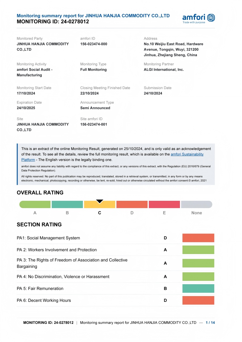 ஜூலை 2025 இல்,ஜின்ஹுவா ஹன்ஜியா கமாடிட்டி கோ., லிமிடெட்.கூட்டுறவு ஒன்றிய என்செய்ன் நியமித்த மூன்றாம் தரப்பு ஐரோப்பிய ஆய்வு முகமை நிறுவனத்தால் நடத்தப்பட்ட தரநிலைகளுக்கான சர்வதேச வகைப்பாட்டில் (ஐ.சி.எஸ்) தொழிற்சாலை தணிக்கை திட்டத்தில் சி-நிலை சான்றிதழை வெற்றிகரமாகப் பெற்றது. இந்த சான்றிதழ் அமைப்பு நான்கு அடுக்குகளை உள்ளடக்கியது: ஏ, பி, சி, மற்றும் டி. பிரெஞ்சு வர்த்தக மற்றும் தொழில்துறை சேம்பர் (எஃப்.சி.டி) உறுப்பினராக, நிறுவனம் சர்வதேச தொழிலாளர் அமைப்பின் சமூக நிர்வாகத் திட்ட தரமான SA8000 ஐ கடைப்பிடிக்கிறது, அதன் சப்ளையர்கள் மீது சமூக பொறுப்பு தணிக்கைகளை செயல்படுத்துகிறது. தணிக்கை நோக்கம் மனித உரிமைகள், தொழில் உடல்நலம் மற்றும் பாதுகாப்பு, தொழிற்சாலை மற்றும் ஆவணங்கள் மற்றும் ஆவணங்கள் உள்ளிட்ட முக்கியமான பகுதிகளை உள்ளடக்கியது.