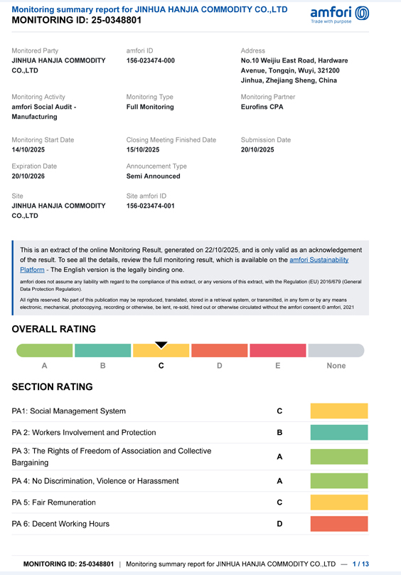 ஜின்ஹுவா ஹன்ஜியா கமாடிட்டி கோ., லிமிடெட் அதன் பிஎஸ்சிஐ தணிக்கை முடிவுகளை வெளியிட்டுள்ளது. அக்டோபர் 14 ஆம் தேதி, நிறுவனம் தொழில்முறை மதிப்பீட்டில் வெற்றிகரமாக தேர்ச்சி பெற்று, வாடிக்கையாளரால் குறிப்பிடப்பட்ட குறைந்தபட்சத் தேவையைப் பூர்த்தி செய்யும் வகுப்பு C சான்றிதழைப் பெற்றது. இந்த சான்றிதழின் செல்லுபடியாகும் காலம் ஒரு வருடம் ஆகும். வாடிக்கையாளர்.இந்த வாடிக்கையாளர் நீண்ட காலமாக எங்கள் நிறுவனத்திடமிருந்து ஒயின் ஓப்பனர்கள், ஒயின் பாகங்கள் மற்றும் காக்டெய்ல் ஷேக்கர் போன்ற துருப்பிடிக்காத எஃகு பொருட்களை வாங்குகிறார். வாடிக்கையாளரின் நாட்டிற்கு இந்த சான்றிதழை வழங்குபவர்கள் தேவை.