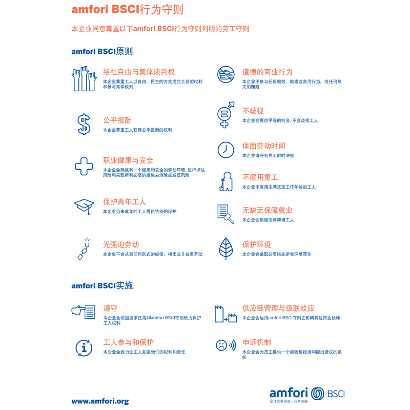 BSCI விதிமுறைகளின் தேவைகளுக்கு இணங்க, BSCI கொள்கைகளை திறம்பட செயல்படுத்துவதை உறுதி செய்வதற்காக, Amfori BSCI நடத்தை விதிகளில் குறிப்பிடப்பட்டுள்ள தொழிலாளர் வழிகாட்டுதல்களை எங்கள் நிறுவனம் கண்டிப்பாக கடைபிடிக்கும். உற்பத்தி செயல்பாட்டின் போது, தொழிலாளர்களின் உரிமைகளை நாங்கள் மதிக்கிறோம். நியாயமான தொழிலாளர் நடைமுறைகள் மற்றும் இழப்பீடு கிடைக்கும். கூடுதலாக, தொழிலாளர்களுக்கு ஒழுக்கமான வேலை நேரம் மற்றும் பிற அடிப்படை உரிமைகள் இருப்பதை நாங்கள் உத்தரவாதம் செய்கிறோம்.