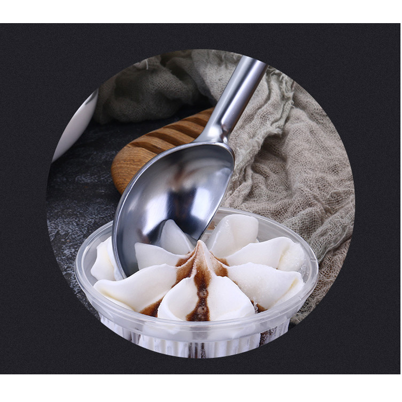 இந்த ஜிங்க் அலாய் ஐஸ்கிரீம் ஸ்கூப், பிரீமியம் துத்தநாக அலாய் மூலம் பிரீமியம் துத்தநாக அலாய் மூலம் வடிவமைக்கப்பட்டு, கூர்மையான மூலைகள் இல்லாமல், சுகமான, வட்டமான பிடி அனுபவத்தை உறுதிசெய்கிறது. 16.5 செ.மீ நீளம் இருந்தபோதிலும், ஸ்கூப் 75 கிராம் வரை எடை கொண்டது. அதிக வெப்பநிலையில் சுடப்பட்ட பூச்சு (120°C) பூசப்பட்டு, நீடித்த மற்றும் இறகு-ஒளி அமைப்பை உருவாக்குகிறது. ஸ்கூப் ஹெட் ஒரு திறந்த-படகு வடிவத்தை தனித்துவமாக வடிவமைக்கப்பட்ட 108-டிகிரி வெளிப்புற-கோண முனையுடன் ஏற்றுக்கொள்கிறது, இது உறைந்த ஐஸ்கிரீம் வழியாக சிரமமின்றி வெட்டுகிறது. அலை அலையான, அலை அலையான மேற்பரப்பு தடையற்ற ஐஸ்கிரீம் வெளியீட்டை அனுமதிக்கிறது. இந்த சிந்தனைமிக்க வடிவமைப்பு, திறமையின் அளவைப் பொருட்படுத்தாமல் யாருக்கும் சிரமமின்றி பயன்படுத்துவதை உறுதி செய்கிறது.